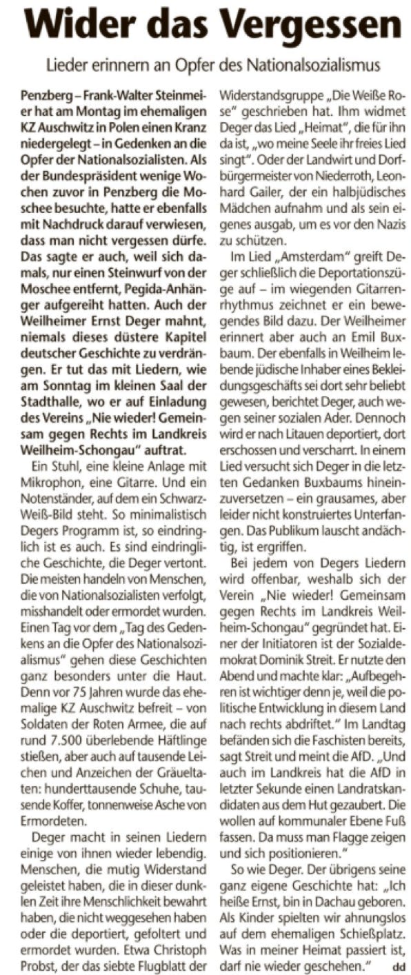 Der Verein hatte zu einem musikalischen Abend mit dem Liedermacher Ernst Deger nach Penzberg eingeladen. Der noch sehr junge Verein wollte am Vorabend des Holocaust Gedenktages ein Zeichen setzen. Rund 20 Personen folgten diesem Aufruf. Es wurde ein sehr ergreifendes Ereignis. Ernst Deger verstand es seine Zuhörer in seinen Bann zu ziehen und alle Anwesenden daran zu erinnern, dass so etwas nie wieder passieren darf. Menschen zu quälen, zu bestehlen und zu ermorden nur weil sie einen anderen Glauben haben. Nicht weil sie Verbrechen begingen oder sonstiges Unrecht, sondern weil sie Juden waren. Ernst Deger erzählte von einzelnen Schicksalen und begleitete dies einfühlsam auf seiner Gitarre.